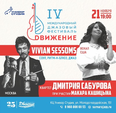 Концерт джазовой вокалистки Вивиан Сессомс (США). Квартет Дмитрия Сабурова с участием Макара Кашицына (Москва). Джазовый фестиваль "Движение"